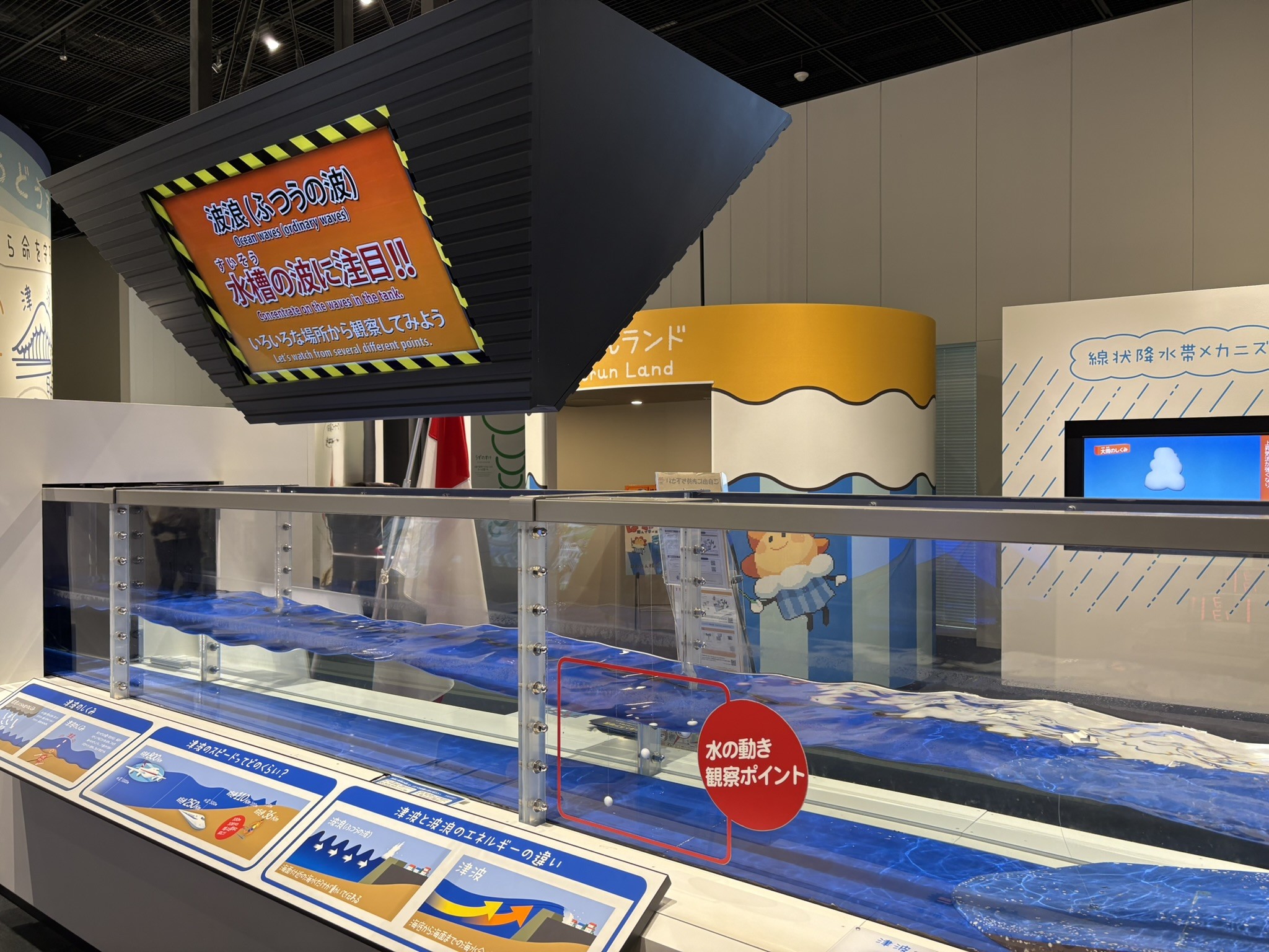 また津波について学べる「津波シュミレーター」は波浪(普通の波)と津波のボタンを押すと模擬的な波が発生する装置です。