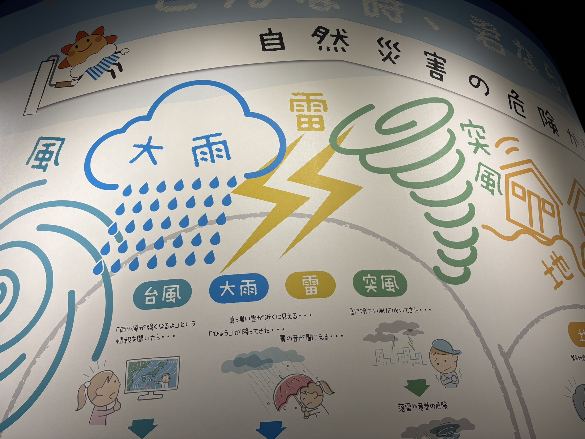 こちらの施設は天気や津波、台風などの自然現象や災害などをゲームなどを通して学べる施設になっています。