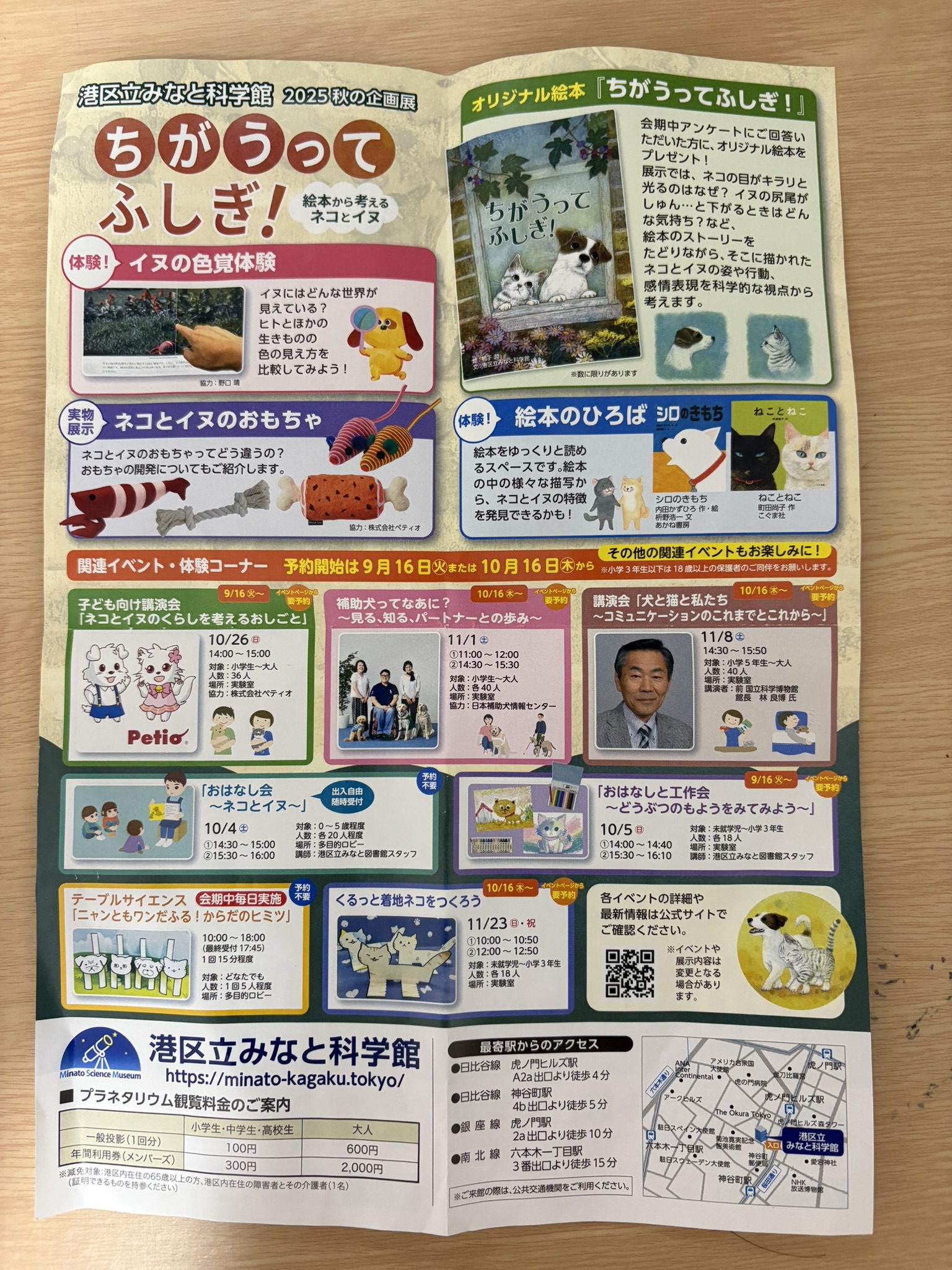 またこの日は、秋の企画展 「ちがうってふしぎ! ~絵本から考えるネコとイヌ~」を開催しており子供たちが楽しめる工作が無料で楽しめることも教えていただけました。
